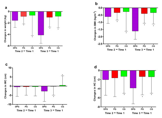 Changes in weight outcomes at Time 1 and Time 2 compared to baseline. Changes in weight outcomes included (a) changes in weight, (b) changes in body mass index (BMI), (c) changes in waist circumference (WC) and (d) changes in hip circumference (HC). DPG: dietary and physical activity interventions group; PG: physical activity interventions group; CG: control group; * p < 0.05 for the comparison of changes with DPG.