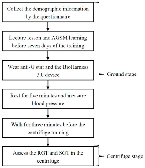 First, we used a questionnaire to collect participants’ demographic data, including age, gender, height, weight, body mass index (BMI), smoking status (yes: current smoker and ex-smoker, no), drinking status (yes: current drinker and ex-drinker, no), and exercise habits (yes, no). An aviation physiologist at APRL gave a lecture about acceleration physiology and demonstrated and described the techniques of AGSM for all participants. The techniques of the AGSM operation focus on forced respiration (also called the Valsalva maneuver) and lower body muscle strain. The participants learned to perform the AGSM properly and continued to master the AGSM before seven days of centrifuge training.