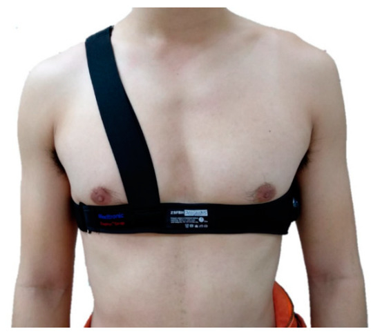 The noninvasive mobile device used in the study was a BioHarness 3.0 (Zephyr Technology Corporation, Annapolis, MD, USA) equipped with a three-axis gyroscope and accelerometers to record the acceleration by piezoelectric technology. The main physiological parameters included the activity level, HR, and breathing rate. The activity level was calculated from the acceleration in the x, y, and z directions during the experiment. HR was measured by a conductive electrode sensor with the elasticity of the thoracic loop strap fit to the thoracic skin. The breathing rate was evaluated by a capacitive pressure sensor to evaluate the circumferential expansion and contraction of the chest wall. A shoulder strap was used to reduce the noise caused by displacement during physical activity [21]. The monitoring data could be displayed in real time by Bluetooth technology and stored in a memory to be exported for statistical analysis.