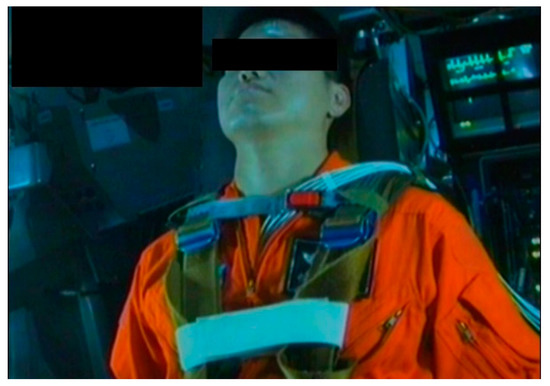 On the day of the G tolerance test, they performed warm-up exercises and practiced the AGSM on the ground. Then, they wore five-bladder anti-G suits, and BioHarness 3.0 devices were used to record a variety of data of interest. The sensors were attached to the chest and shoulder straps and located at the left central armpit (Figure 2). The aviation physiologist turned on the BioHarness 3.0 devices worn by the participants to collect the data and examine their function and signal. After the participants rested in a seated position for five minutes, we measured their systolic blood pressure (SBP) and diastolic blood pressure (DBP) in a relaxed state by an Omron 1100U sphygmomanometer (Omron Healthcare Company, Taipei City, Taiwan). The aviation physiologist instructed them to squat down and stand up and then start walking at normal speed. After three minutes of walking, they squatted down and stood up again to complete the ground stage.