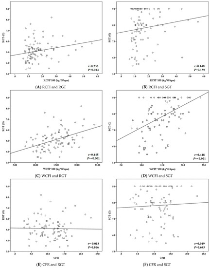 As shown in Table 2, the average values of resting SBP, DBP, and HR were 141.80 ± 13.75 mmHg, 80.78 ± 7.03 mmHg, and 84.07 ± 11.15 bmp before the G tolerance test, respectively. The mean value of the WCFI was much higher than that of the RCFI (WCFI vs. RCFI: 0.15 ± 0.04 kg × G/bpm vs. 0.02 ± 0.04 kg × G/bpm). The average CFR computed from the WCFI divided by the RCFI was 10.77 ± 4.11. The average RGT and SGT of the participants were 5.1 ± 0.9 G and 7.8 ± 1.1 G, respectively, during the G tolerance test. The percentages of participants with an RGT greater than 5 G or an SGT greater than 8 G were equally noted as 54.3%. The distribution of the RCFI was positively correlated with RGT performance (r = 0.236, p = 0.024). In addition, the WCFI was also significantly correlated with the RGT (r = 0.445, p < 0.001) and SGT (r = 0.448, p < 0.001), as shown in Figure 6.