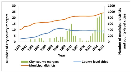 Number of municipal districts, county-level cities and city-county mergers since 1978.