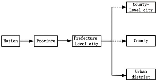 China currently consists of four main administrative hierarchies under a single system of government: national, provincial, prefectural-level city and county (see Figure 2). Chinese cities are characterized by distinct administrative hierarchy and cities with higher administrative levels having greater access to resources. This kind of urban administrative hierarchy established by administrative power is fundamental feature that distinguishes Chinese cities from those in Europe and the United States. Under this system, counties (county-level cities) and urban districts, whose are subordinated to prefecture-level cities have the same grade level and widely differing competencies between two levels of government. The main difference between them lies in their different discretionary powers over local affairs. The counties (county-level cities) under the jurisdiction of the cities are constitutionally subordinate administrative units with relative independence in terms of financial, administrative and human rights, while the municipal districts are under the direct jurisdiction of the prefecture-level cities and have relatively limited autonomy. The economic and transport links between urban districts have been greatly enhanced within the city jurisdiction, which leads to the urban districts becoming a unified body of urban economic and social policy []. Compared with urban districts, local governments in counties (county-level cities) have more autonomy in local affairs. In general, a significant change following city-county mergers is that coordination costs between municipal governments and the merged counties tend to be significantly lower. It remains to be tested whether the reduction in coordination costs brought about by the city-county mergers means that it is no longer sufficient to shake the reform dividends of the mergers and will not have a negative impact on the reduction in urban energy intensity. We follow the approach of Tang and Hewings (2017) and do not distinguish between counties and county-level cities in this study []. According to the Regulations on the Reform of China’s Administrative System, which is issued by China’s State Council in 1985, there are several steps in the implementation of city-county merger policy. The local governments (prefecture-level cities and counties) propose the mergers, which are reviewed and submitted by the provincial governments, the central government and the Ministry of Civil Affairs have the final approval or veto power.