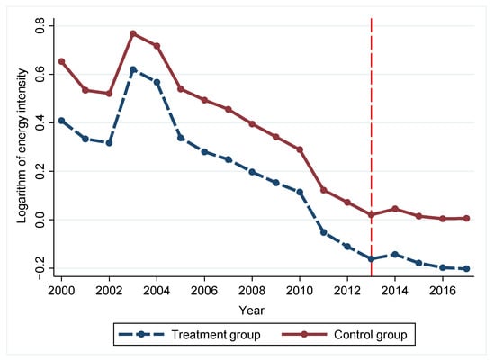 We plotted the treatment group against the control group to illustrate the changes before and after mergers, which can be seen in Figure 3. It is difficult to depict the changes before and after mergers in different years in a single graph because the timing of mergers in the sample cities is not consistent. A total of 48 cities have undergone mergers up to 2013, which account for 49.5% of the treatment group. We refer to Wu et al. (2019) and use 2013 as the time of policy implementation for the analysis []. The energy intensity of the treatment and control groups basically showed parallel trends before 2013 and did not vary systematically over time, so the prerequisites for using DID were met.