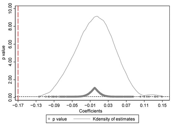 We randomly selected 97 cities from 225 cities by the computer as the “pseudo-treatment group”, assuming that these 97 cities had implemented the merger policy and the other cities were the control group, and then generated “pseudo-policy dummy variables” for regression. Since the treatment and control groups are randomly assigned, we can expect the policy effect of the “pseudo-policy dummy variables” on urban energy intensity to be zero, otherwise the policy effect we obtained in the previous section is unreliable. At the same time, if merger policy really has a significant and positive effect on reducing energy intensity, we can expect the true estimated coefficient (−0.170) to be on the left of the placebo effect. It was repeated 500 times and the results are shown in Figure 4. We can see the estimated coefficients are mostly concentrated near the zero, and the p-values of most estimated values are greater than 0.1 (not significant at the 10% level), indicating that our estimate results are unlikely to be obtained by accident, and therefore are unlikely to be affected by other policies or random factors, which once again prove the robustness of the results.
