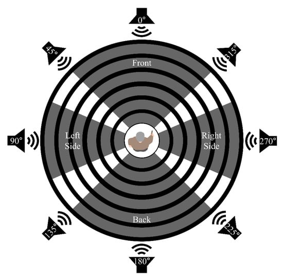 In a sound-proof booth, eight directional speakers (Yamaha HS5, Hamamatsu, Shizuoka, Japan) were set to perform a series of experiments. Figure 1 describes the simulation setting where the subject sitting in the center of the chamber was 1 meter away from each speaker; that is, speakers were spatially separated at 45° intervals. For example, the first speaker was aligned to the subject (0°) and the other speakers were located at 45°, 90°, 135°, 180°, 225°, 270°, and 315°, respectively, in a counterclockwise direction. Furthermore, to make participants easy to identify, each speaker was assigned a number (i.e., 1 to 8) in the same manner as the degree of speakers.