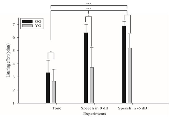 In Figure 2, the OG shows 3.32 points (SD: 0.95), 6.36 points (SD: 0.64), and 6.88 points (SD: 0.33) for tone, speech in 0 dB SNR, and speech in –6 dB SNR conditions, respectively. For the meaningless tone in a quiet environment, little listening effort was required compared to a lot of effort required when presenting a noise and meaningful speech. As the control group, the YG reported the amount of listening effort as 2.68 points (SD: 0.75), 3.72 points (SD: 0.79), and 5.20 points (SD: 0.91) for the three conditions, suggesting that YG used much less effort than the OG.