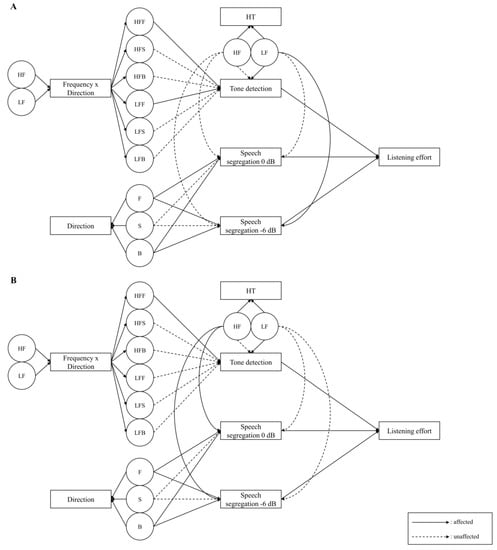 Multiple linear regression model of the older adults (A) and young adults (B). HF, high frequency; LF, low frequency; HFF, high frequency front; HFS, high frequency side; HFB, high frequency back; LFF, low frequency front; LFS, low frequency side; LFB, low frequency back; F, front; S, side; B, back; HT, hearing threshold.