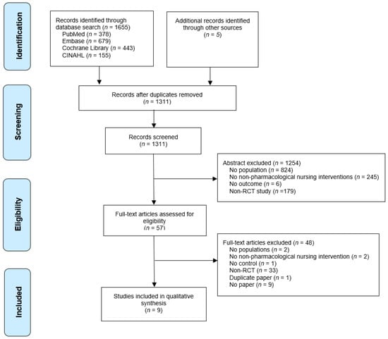 The study selection process for the systematic review is shown in Figure 1. As a result of searching the four databases, 1655 articles (378 in PubMed, 679 in Embase, 443 in the Cochrane Library, and 155 in CINAHL) were identified; a total of 1660 articles were identified by additionally searching five gray literature databases. After 349 duplicate studies were removed, the title and abstract of 1311 articles were checked, and 57 studies that met the inclusion criteria were selected. Fifty-seven full-text articles were reviewed, and two non-hospitalized population studies, two non-pharmacological nursing intervention studies, one study without a control group, 33 non-RCTs, one duplicate published study, and nine full-text articles were excluded. After excluding 48 articles, nine articles were finally included in the systematic review.