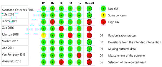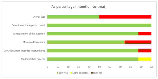 The quality assessment results of the eight selected studies are presented in Figure 2 and Figure 3. Regarding the overall bias, four studies had a low risk [10,12,13,22], and five studies had high risk [8,9,11,14,23]. Regarding the randomization process, eight studies had a low risk of bias [8,10,11,12,13,14,22,23], and one study had some concerns [9]. Regarding deviations from intended interventions, eight studies had a low risk of bias [9,10,11,12,13,14,22,23], and one study had a high risk [8]. Regarding missing outcome data, seven studies had a low risk of bias [8,9,10,12,13,22,23], and two studies had a high risk [11,14]. Regarding the measurement of the outcome, eight studies had a low risk of bias [8,10,11,12,13,14,22,23], and one study had a high risk [9]. Regarding the selection of the reported result, eight studies had a low risk of bias [8,9,10,11,12,13,14,22], and one study had a high risk [23].