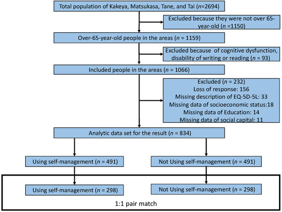 Figure 1 shows a flowchart of the participant selection process. The total population of Kakeya, Matsukasa, Tane, and Tai was 2694. Among them, 1159 were over 65 years old. We included a total of 1066 participants; of them, 232 were excluded due to the lack of responses and missing data regarding the description of EQ-5D-5L, socioeconomic status, education, and social capital (Figure 1).