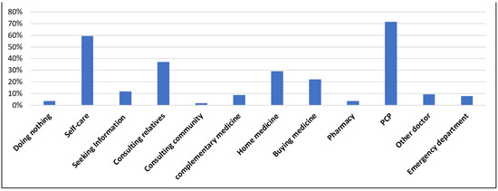 The percentage of each HSB regarding mild symptoms. Note: consulting relatives, consulting family and friends; consulting community, consulting community members; complementary medicine, using complementary medicine; home medicine, using home medicine; buying medicine, purchasing over-the-counter drugs; pharmacy, consulting with pharmacists; PCP, consulting with primary care physicians; other doctor, visiting medical institutions (other than primary care physicians); emergency department, visiting emergency rooms of general hospitals (including calling an ambulance).