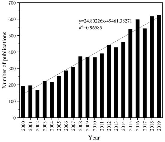 The annual volume of publications reflects the level and growth of a field to a certain degree [33]. As shown in Figure 1, the number of publications on the bioremediation of PCS in the WOS presented a fluctuating upward scenario, and the relationship between annual volume and year was fitted with a linear regression model. The number of published articles grew from 191 in 2000 to 624 in 2019, with an average annual growth rate of 21.7%, which indicates that the field of PCS bioremediation had gained increasing attention in the last two decades and that the number of scientific research achievements had been increasing. Nonetheless, neither the total number of publications nor the growth rate had greatly improved, which indicates that there was still a large space for development. It can be predicted that the bioremediation of PCS will be a research hotspot for researchers in the coming years.