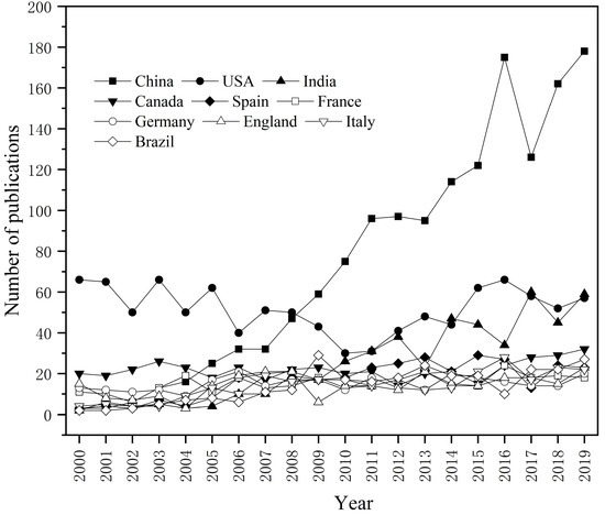 Figure 2 shows the top 10 most productive countries with respect to the time-trend analysis during 2000–2019. The research on PCS bioremediation in the United States started early, while the number of articles published from 2000 to 2009 showed a stable state, and the number of articles published increased year by year since 2010. Although China started a little bit late in the field of PCS bioremediation, the number of articles published increased rapidly. In 2009, China surpassed the United States as the country with the largest number of publications. This shows that in recent years, with the rapid development of China’s economy and the acceleration of industrialization, the problem of PCS in China had become increasingly prominent and had gradually received extensive attention. Simultaneously, the remediation technology had also gradually developed from high-cost and irreversible physical and chemical technology to low-cost, no secondary pollution biotechnology and biological combined remediation technology. In addition to China and the United States, the annual number of publications issued by the other eight major countries showed an increasing trend year by year.