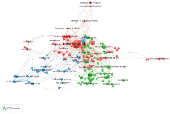 A total of 4070 institutions were involved in the 7575 publications related to PCS bioremediation during 2000–2019. The top 10 most productive institutions in terms of total publication numbers are shown in Table 3. The top 10 institutions originated from six countries—namely, China (4), France (2), India (1), Russia (1), Spain (1), Germany (1)—and accounted for 1329 total publications (17.5%). The United States, Canada, England, Italy, and Brazil belonged to the 10 most productive countries and regions. However, none of these countries’ institutions appeared in the list of the top 10 most productive institutes. The Chinese Academy of Sciences reported the highest number of publications, with 347 articles, which accounted for 4.6% of the total number of citations. The total frequency of citations was also the highest, which was 8994. From the total number of publications, citation frequency, and h-index, it can be seen that the Chinese Academy of Sciences has made outstanding contributions in the field of PCS bioremediation. The average citations of articles published by two French institutions, Center National De La Recherche Scientifique and Universite De Lorraine, reached 39.2 and 39.6, respectively, indicating that they made a significant contribution to the field of PCS bioremediation. VOSviewer software was used to visualize the cooperative relationships among the research institutions with more than 15 articles published in the field of PCS bioremediation. The results are shown in Figure 4. There were close and complex cooperative relationships among almost all institutions, and the cooperation network can be divided into three clusters: red, green, and blue. The red cluster is represented by the Chinese Academy of Sciences, primarily consisting of research institutions form China, South Korea, and the United States; the green cluster is chiefly composed of institutions from European countries, such as Spain and Russia; the blue cluster mainly is comprised institutions from Australia, and also includes some institutions from Middle East countries, such as Iran, and Asian countries, such as India. As shown in Figure 4, the Chinese Academy of Sciences was not only the institution with the largest number of papers but also the institution with the largest partnership and cooperation intensity. It cooperated with 52 institutions, with a total cooperation intensity of 220. This shows that the Chinese Academy of Science made an outstanding contribution and had great influence in PCS bioremediation. All research institutions were inclined to cooperate with other domestic institutions. Therefore, strengthening cooperation with overseas institutions is suggested.