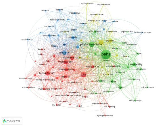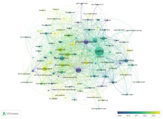 VOSViewer was used to generate a keywords co-occurrence network that shows the connection and weightage of the top 100 most high frequency author keywords, and the results are displayed in Figure 5. A complex and close relationship was formed between the keywords. Each circle represents a keyword. The size of the circle reflects the number of occurrences of a keyword. The connection means a co-occurrence relationship between two keywords, and the color represents the cluster of the keyword—that is, the research topic. As can be seen from Figure 5, keywords were divided into four clusters, cluster 1, cluster 2, cluster 3, and cluster 4 are represented by blue, green, red, and yellow, respectively. The keywords “bacteria”, “fungi”, and “DGGE” indicate that cluster 1 focused on the analysis of microorganisms and the change of microbial diversity, which is more than important for improving the efficiency of bioremediation [44]. From the keywords “phenanthrene”, “pyrene”, and “fluoranthene”, it can be seen that cluster 2 mainly involves the study of the degradation of single pollutants, which is helpful for understanding the degradation characteristics of certain pollutants [45]. Cluster 3 contains keywords related to microbial remediation, such as “biostimulation” and “bioaugmentation”, which are important technologies of microbial remediation [46,47]. In addition, BS strengthening bioremediation of PCS is also an important theme. Cluster 4 focuses on phytoremediation, which can be seen from the keywords such as “phytoremediation”, “plants”, and “rhizosphere”. Cluster 4 also includes the keyword “bioavailability”. Bioavailability is one of the basic principles for judging whether microorganisms are suitable for remediation of contaminants [48]. The study of bioavailability can better evaluate the degradation efficiency of petroleum hydrocarbons by microorganisms and should be the priority research goal in bioremediation [49]. These four clusters reflect the main research content of the current publications on bioremediation of PCS.