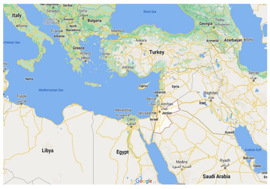 Jordan is located between the Arabian Desert and the Eastern Mediterranean area (see Figure 1), which explains the climatic conditions of the country that are characterised by long, hot, and dry summers and short, cold winters. In fact, December, January, and February are the coldest months, with maximum/minimum average temperatures equivalent to 10 °C to 5 °C, respectively. However, July, August, and September are considered to be the hottest months, with maximum/minimum average temperatures ranging from 35 °C to 20 °C. During the summer, the daily temperature increases considerably until reaching or exceeding 40 °C in some cases, particularly when a hot, dry, south-easterly wind blows. Generally, in winter, significant amounts of precipitation fall (between 200–400 mm) but decrease/stop during the summer season.