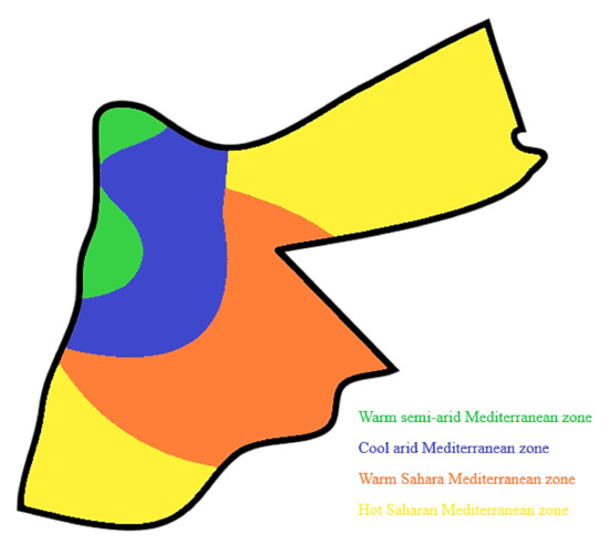 There are different climate zones in Jordan, some of which are similar to the Mediterranean climate and others that are almost like the desert climate. The Jordanian weather is characterised by four distinct seasons, as shown in Figure 2, where autumn and spring offer an ideal range for human comfort. The main climate zones in the major Jordanian cities are as follows [45]:
