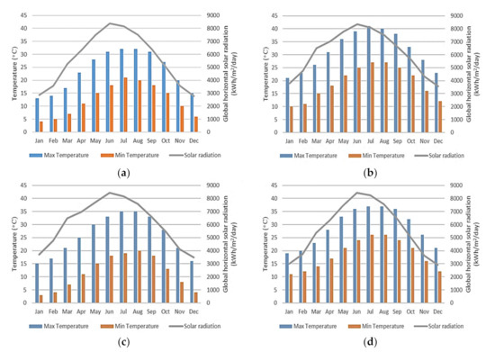 Average temperature and radiation profile for each climate. (a) Semi-arid Mediterranean, Warm. (b) Saharan Mediterranean, hot. (c) Saharan Mediterranean, warm. (d) Arid Mediterranean, cool.