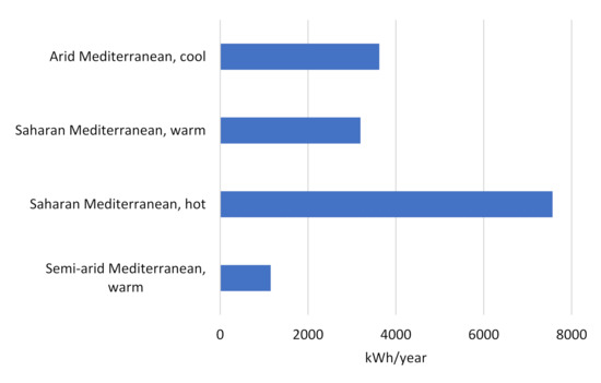 The energy-saving percentage reduced to around 23% in the hot Saharan Mediterranean, where the hottest climate conditions can be found. This could be explained by the fact that solar radiation is not the only climate factor that impacts the amount of cooling in hot regions. In these types of regions, other factors, such as ambient temperature, should be taken into consideration. Further, in hot climates, direct radiation does not only enter the building through window openings; the building can gain a significant amount of heat through conduction through other building envelope elements (wall, roof, etc.). The energy-saving results for the semi-arid Mediterranean climate amount to around 820 kWh/year, which accounts for 71% of the cooling consumption. Therefore, it can be considered that solar gain through windows constitutes the main source of heat transfer to the building in this climate.
