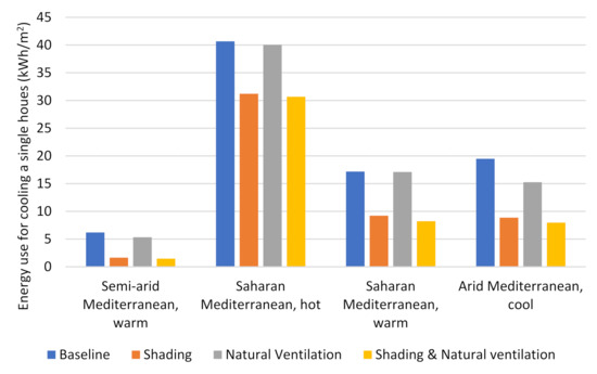 Annual energy consumption for residential buildings’ space cooling per area unit in different climates.