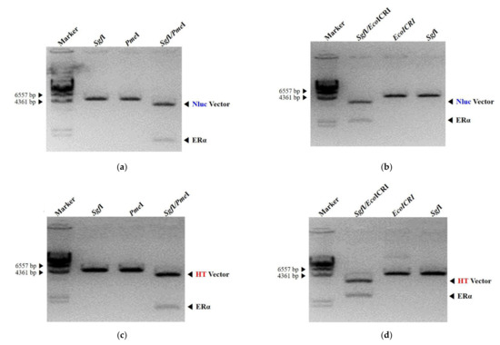 Estrogen receptor-alpha (ERα) fused with NanoLuc luciferase (Nluc) and HaloTag (HT) vectors and analyzed by agarose gel electrophoresis. (a) Nluc–ERα: marker, single restriction-enzyme digestion by SgfI, single restriction-enzyme digestion by PmeI, double restriction-enzyme digestion by SgfI/PmeI, respectively. (b) ERα–Nluc: marker, double restriction-enzyme digestion by SgfI/EcoICRI, single restriction-enzyme digestion by EcoICRI, single restriction-enzyme digestion by SgfI, respectively. (c) HT–ERα: marker, single restriction-enzyme digestion by SgfI, single restriction-enzyme digestion by PmeI, double restriction-enzyme digestion by SgfI, respectively. (d) ERα–HT: marker, double restriction-enzyme digestion by SgfI/EcoICRI, single restriction-enzyme digestion by EcoICRI, single restriction-enzyme digestion by SgfI, respectively.