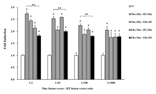 Bioluminescence resonance energy transfer (BRET) signal of the combination 1:1 ratio vector by transient transfection. BRET signal was determined using 10−9 M E2. All data are expressed as means ± SD (n = 3). * 1:1 ratio vector of Nluc-ERα:HT-ERα/1:100 ratio vector of Nluc-ERα:HT-ERα (p < 0.05) ** 1:1 ratio vector of Nluc-ERα:HT-ERα/1:1000 ratio vector of Nluc-ERα:HT-ERα (p < 0.001).