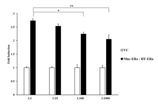 Next, the ratios 1:1, 1:10, 1:100, and 1:000, respectively, were compared to determine the optimal ratio of Nluc and HT fused at the N-terminal of ERα on transient transfection into HEK293 cells (Figure 4). The 1:1 ratio was significantly different compared to 1:1000 (p < 0.05) and 1:100 (p < 0.001), respectively. These results suggested that the optimal combination ratio and position for Nluc and HT vectors to use in the BRET-based ERα dimerization assay were 1:1 and the N-terminal of ERα.