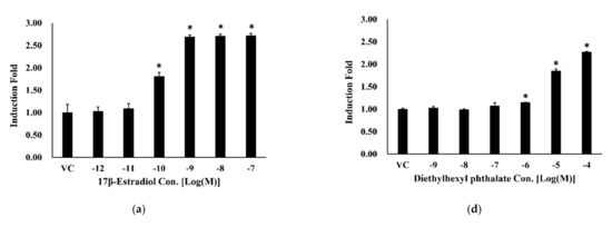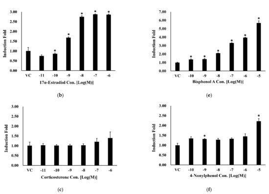Fold induction was calculated as a measured of change between each of the chemical treatment groups and the VC in Equation (3).