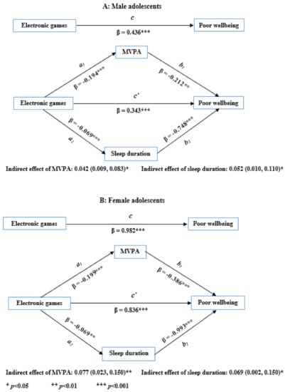 Models of moderate to vigorous physical activity (MVPA) frequency and sleep duration mediating the association between time playing electronic games and psychological wellbeing of (A) male and (B) female adolescents, 2016.