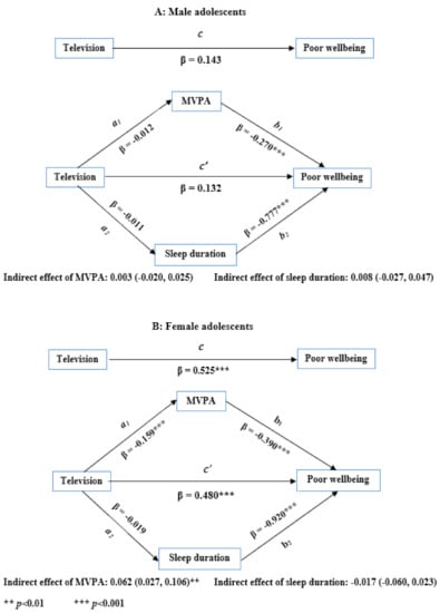 Models of moderate to vigorous physical activity (MVPA) frequency and sleep duration mediating the association between time watching television and psychological wellbeing of (A) male and (B) female adolescents, 2016.