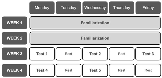 A cross-sectional study was conducted over four weeks. Despite the fact that all participants were familiar with the exercises in all tests, a familiarization session was also scheduled during the first two weeks. All trials were separated by at least 48 h and performed at the same daytime to avoid the effects of circadian rhythms [36]. Participants were also advised to refrain from any strenuous physical activity in the previous 24 h of each trial. Tests performed were: (1) Anaerobic Squat Test at 60% of bodyweight (AST60); (2) Anaerobic Squat Test at 70% of bodyweight (AST70); (3) Repeated Jump Test (RJT); (4) Assault Bike Test (ABT); and (5) Wingate Anaerobic Test on a cycle ergometer (WG). Tests order execution was randomly assigned. The chronology of the tests is shown in Figure 1.