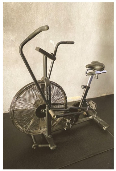 This test was performed with an Assault Bike® Classic model (Assault Fitness Products; Carlsbad, CA, USA). The Assault Bike® is an air-resisted bike with the peculiarity of using both upper and lower extremities simultaneously (Figure 4). This machine has gained its popularity by being used by most CF centers and official competitions worldwide. The test consisted of 30 s at maximal effort. It began with a 15 min warm-up of cycling at 50 rpm (approximately 176 watts). Next, a 5 min recovery interval was established. The test was carried out from a static position without any inertia. To facilitate the initial start, the crank of the dominant leg was previously set to 45 degrees.