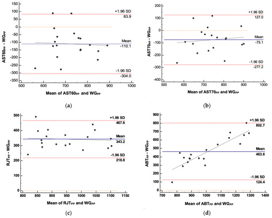 Bland–Altman’s plots representing differences (Y axes) and mean (X axes) of measurements between: (a) AST60 and WG; (b) AST70 and WG; (c) RJT and WG; (d) ABT and WG.