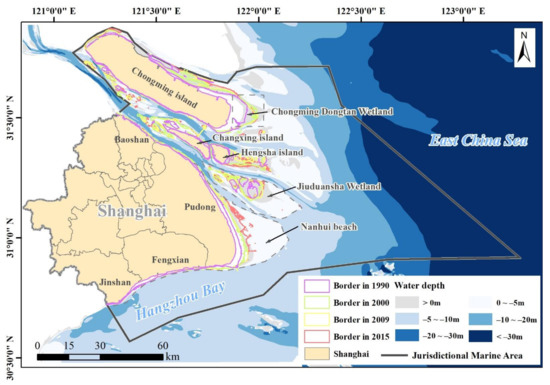 The study area (30°37′ N to 30°54′ N, 121°16′ E to 123°00′ E) is located in the north of the East China Sea, adjacent to the mainland in the west, and next to the waters of the Zhejiang and Jiangsu provinces in the south and north (Figure 1). It includes the coastal zone and the offshore waters and has a total area of 11,231.32 km2 and continental coastline of about 211 km2, as described in the Marine Functional Zoning of Shanghai (2011–2020) (Figure 1). The coastal zone is located at the Yangtze River Estuary, including the coastal area of Chongming Island, the tidal flats of Changxing Island and Hengsha Island, Jiuduansha Wetland, the beaches of Nanhui District, Fenxian District and Jinshan District. The internal border of the coastal zone is the coastal line of 1990 (Figure 1). The external border of the coastal zone changed, being pink in 1990, green in 2000, yellow in 2009 and red in 2015, corresponding to the expansion of the coastal area (Figure 1). The offshore waters include most of the Yangtze River Estuary, a small part of Hangzhou Bay and part of the East China Sea.