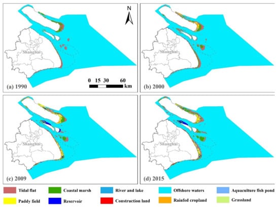 The distribution of the land use/land cover types along the Shanghai coastal area from 1990 to 2015. (a) The spatial distribution of land use/land cover types in the study area in 1990. (b) The spatial distribution of land use/land covers in the study area in 2000. (c) The spatial distribution of land use/land cover types in the study area in 2009. (d) The spatial distribution of land use/land cover types in the study area in 2015.