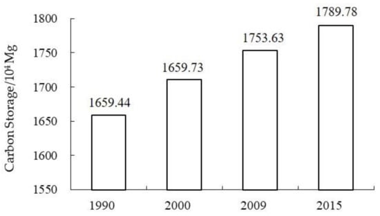 The total amount of CBCS increased from 1659.44 × 104 Mg to 1789.78 ×104 Mg during 1990–2015 (Figure 3), though the amount of Shanghai’s coastal carbon sequestration showed a decreasing trend in the three periods: 51.28 × 104 Mg in 1990–2000, 42.90 × 104 Mg in 2000–2009 and 36.15 × 104 Mg in 2009–2015, respectively. The total amount of carbon sequestration was 130.48 × 104 Mg from 1990 to 2015.