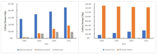 The CBCS in natural wetlands, artificial wetlands and other lands showed an upward trend during 1990–2015, with a different growth rate in the three periods (1990–2000, 2000–2009 and 2009–2015) (Figure 4). The CBCS of the artificial wetlands and the other lands increased dramatically, with a growth rate of 422.45% and 37.3.82%, respectively, during 1990–2000, after which their growth rates decreased to 85.35% and 35.92%, respectively, during 2000–2009, and finally their growth rates decreased to 34.71% and 1.56%, respectively. The natural wetlands had a relatively constant growth rate (average 17.01%) during 1990–2015. The CBCS of the coastal zone showed an upward trend with an average growth rate (average 25.12%) during 1990–2015, while the CBCS of the offshore waters remained relatively stable, with only a slightly negative growth rate (average −1.28%).
