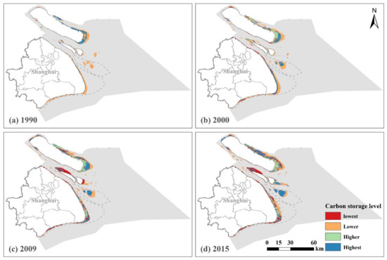The spatiotemporal distribution of the four levels (Highest, Higher, Lower and Lowest) of blue carbon storage in the Shanghai coastal area during 1990–2015. (a) The spatial distribution of the four levels of coastal blue carbon storage in the study area in 1990. (b) The spatial distribution of the four levels of coastal blue carbon storage in the study area in 2000. (c) The spatial distribution of the four levels of coastal blue carbon storage in the study area in 2009. (d) The spatial distribution of the four levels of coastal blue carbon storage in the study area in 2015.