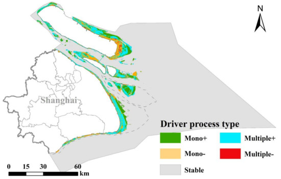 A combination of natural and human-driven processes may be different from the combination of a single driving process, leading to more types of complex influences. Thirty-three driving processes were identified in Shanghai’s coastal area, including four natural processes (e.g., accretion, succession, erosion, etc.), two human processes (reclamation and restoration) and twenty-seven human–natural coupled processes; they were further classified into four types: Mono+, Mono−, Multiple+ and Multiple− driving processes.