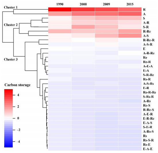 Figure 7 indicates the changes in blue carbon storage as influenced by the thirty-three types of driving processes. The clustering results show the amount of the carbon storage related to the driving processes in the different years. The first clustering group indicates that R and A drove the changes in LULC types, with high CBCS (>2) from 1990 to 2015. R reduced the CBCS, while A increased the CBCS. The second clustering group indicates that S, A-R, S-R, R-Re and A-S drove the change in LULC types, with a higher CBCS (0~2) from 1990 to 2015. These driving processes increased the CBCS. The second clustering group indicated that twenty-six driving processes drove the change in LULC types, with a low (<−2) and lower CBCS (−2~0) from 1990 to 2015. These had little influence on the CBCS.