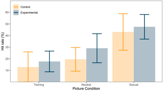 The PRT was evaluated using signal detection theory [49]. Hit rates for each picture category (sexual, neutral, training) and false alarm rates were used in the analysis (Table 2). The false alarm rates were low for both experimental (M = 18.0%, SD = 16.3%) and control (M = 15.9%, SD = 16.5%)) group and no significant difference was found between them (p = 0.64). Mixed ANOVA was performed for hit rates with one within-subject factor (Trial condition: sexual, neutral, training) and one between-subject factor (Group: experimental and control).