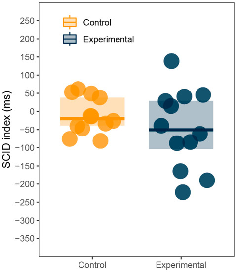 Although the study was not designed to assess the SCID effect, the large number of training trials which use only neutral stimuli allows for a comparison between them and sexual trials. If there was a SCID effect in our data, participants would react faster in trials with no sexual content. Reaction time means were computed from the last ten training trials and the first ten sexual trials for each participant. SCID index was calculated by subtracting training trials from sexual trials, as in previous research [53]. Unlike the AB index, positive values indicate slower reactions to sexual pictures and therefore the SCID effect, whereas negative values indicate faster reaction to sexual pictures. Since the index for both groups failed the Shapiro-Wilk normality test (p < 0.001), Wilcoxon signed-rank test and Mann-Whitney U test were used. SCID index did not statistically differ from zero for both experimental (M = 48.35, Mdn = 50.41, SD = 108.11, p = 0.18) and control (M = −18.60, Mdn = 13.40, SD = 115.61, p = 1) group. Additionally, there was no difference in SCID index between groups (p = 0.15). See Figure 3 for illustration.