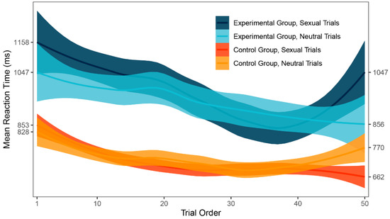 In the main analysis, no significant difference was found between the mean response times to sexual and neutral trials in both experimental and control group. One possible explanation might be that there was an important change in attention bias throughout the task because participants were learning how to ignore sexual stimuli. To evaluate such potential change, local polynomial regression fitting [54] was used on the data to create a smoothed graph (Figure 4), which might then be visually inspected. A learning curve was apparent for both groups in the first part of the task. Additionally, the graph shows a large difference in inter-group variability of response times. There seems to be no attention bias in any part of the DPT for either group.
