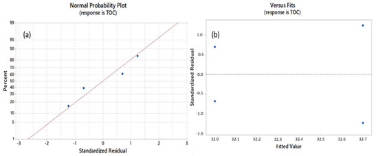 (a) Normal probability plot, (b) residual versus the fitted value of the data after CFD process, with TOC as response.