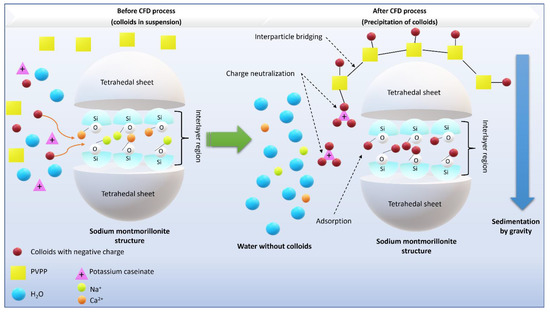 Figure 4 shows the interactions of activated sodium bentonite, potassium caseinate, and PVPP, with the colloids present in the wastewater. When bentonite was added, a mechanism of adsorption and charge neutralization occurred, attracting the colloids present in the WW to the interlayer region of the clay [73]. A similar mechanism was observed with the employment of potassium caseinate, which due to the different charges, attracted the negatively chargeed particles to the positively charged proteins, producing heavy aggregated particles, which precipitate by gravity [74]. PVPP acted by a mechanism of adsorption and interparticle bridging. The polymer chains of PVPP adsorbed the colloids from the WW, as a result of (1) coulombic (charge–charge) interactions, (2) dipole interaction, (3) hydrogen bonding, and (4) van der Waals forces of attraction [75]. In addition, PVPP creates a tridimensional net that adsorbs on the available surface sites of other particles (such as bentonite and potassium caseinate), thus creating a ‘‘bridge’’ between the particles surfaces, resulting in larger particles that settle more efficiently by gravity.