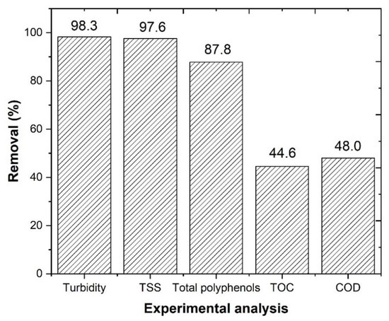 Let Xi be defined as the removal of a given indicator (%) of water contamination (turbidity, TSS, TOC, COD and total polyphenols) that is achieved by a treatment (Equation (2)) [12], as follows: