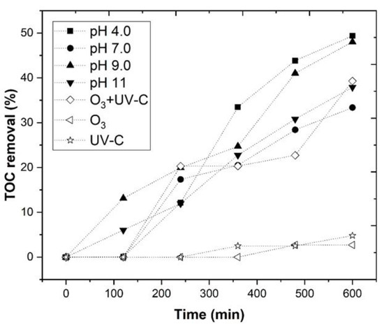 With the application of UV-C radiation at 254 nm, in combination with O3, the TOC removal increased, because ozone absorbs UV-C light [80,81] and the formation of H2O2, by ozone photolysis occurs, which, in turn, produced hydroxyl radicals (), as observed in Equations (10)–(14) [82] as follows: