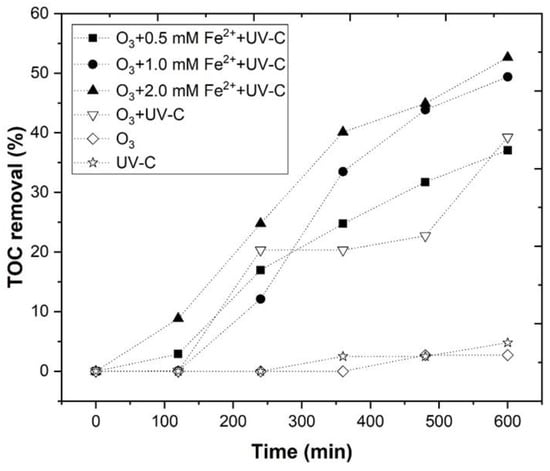 In Figure 7, a TOC removal of 59.0, 63.2, and 66.7% (Table S4), was observed, for 0.5, 1.0, and 2.0 mM Fe2+, respectively. These results agreed with Quiroz et al., [89], who stated that the application of iron with ozone improved the COD removal of industrial wastewater. In addition, in the work of Piera et al. [82], it was reported that Fe2+ can interact with O3 and produce radicals (Equations (23) and (24)), as follows: