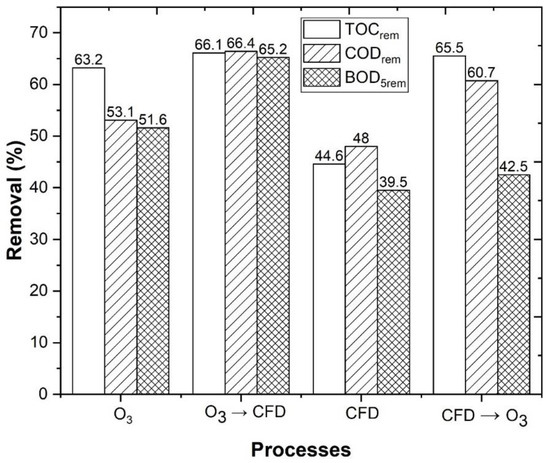 The results in Figure 6 showed a lower TOC removal efficiency for a single O3 application, regarding O3/UV-C. These results can be explained by two mechanisms through which ozone can degrade organic pollutants, such as direct electrophilic attack (Equation (7)) and indirect attack, through the formation of hydroxyl radicals (Equations (8) and (9)) [78,79], which are shown as follows: